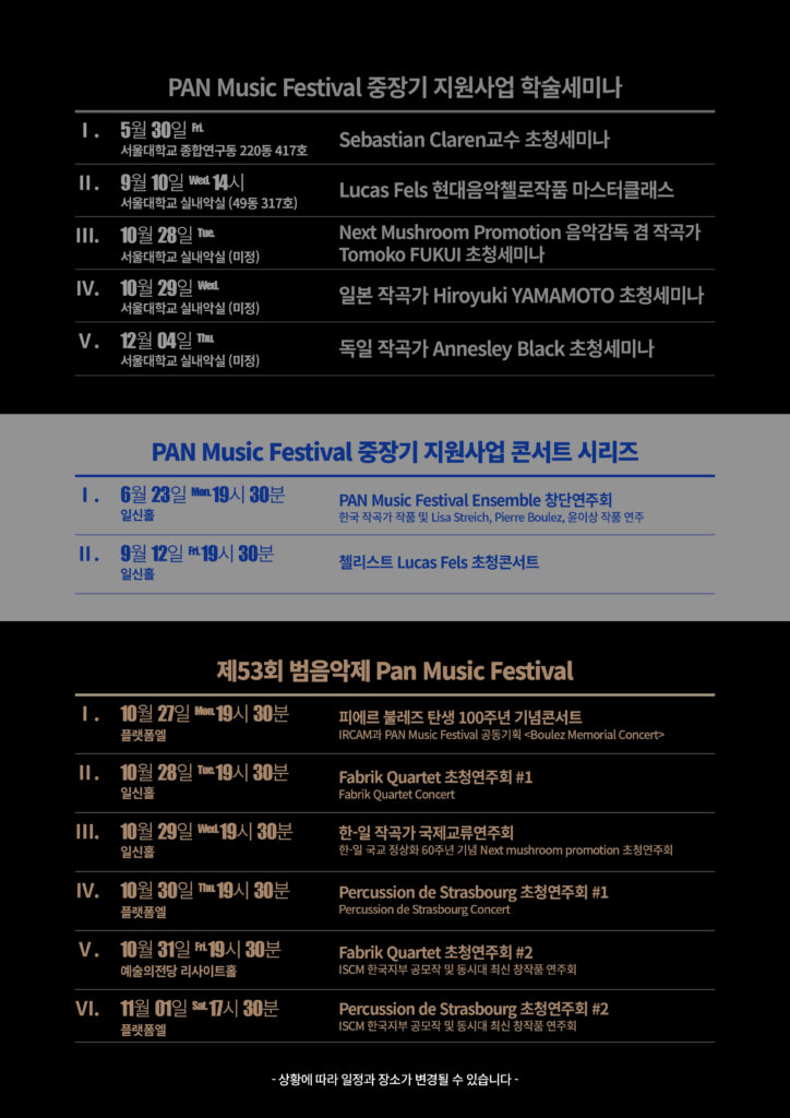 The Pan Music Festival held in Seoul, South Korea. Organised by the Korean Society for Contemporary Music, it takes place several times throughout the year (as I recently learnt). Among these, a “Korea-Japan Exchange Concert” featuring the Osaka-based ensemble Next Mushroom Promotion will be held on 29th October. My work, Contour-ism VI for flute, violin and piano, will be performed at this concert.